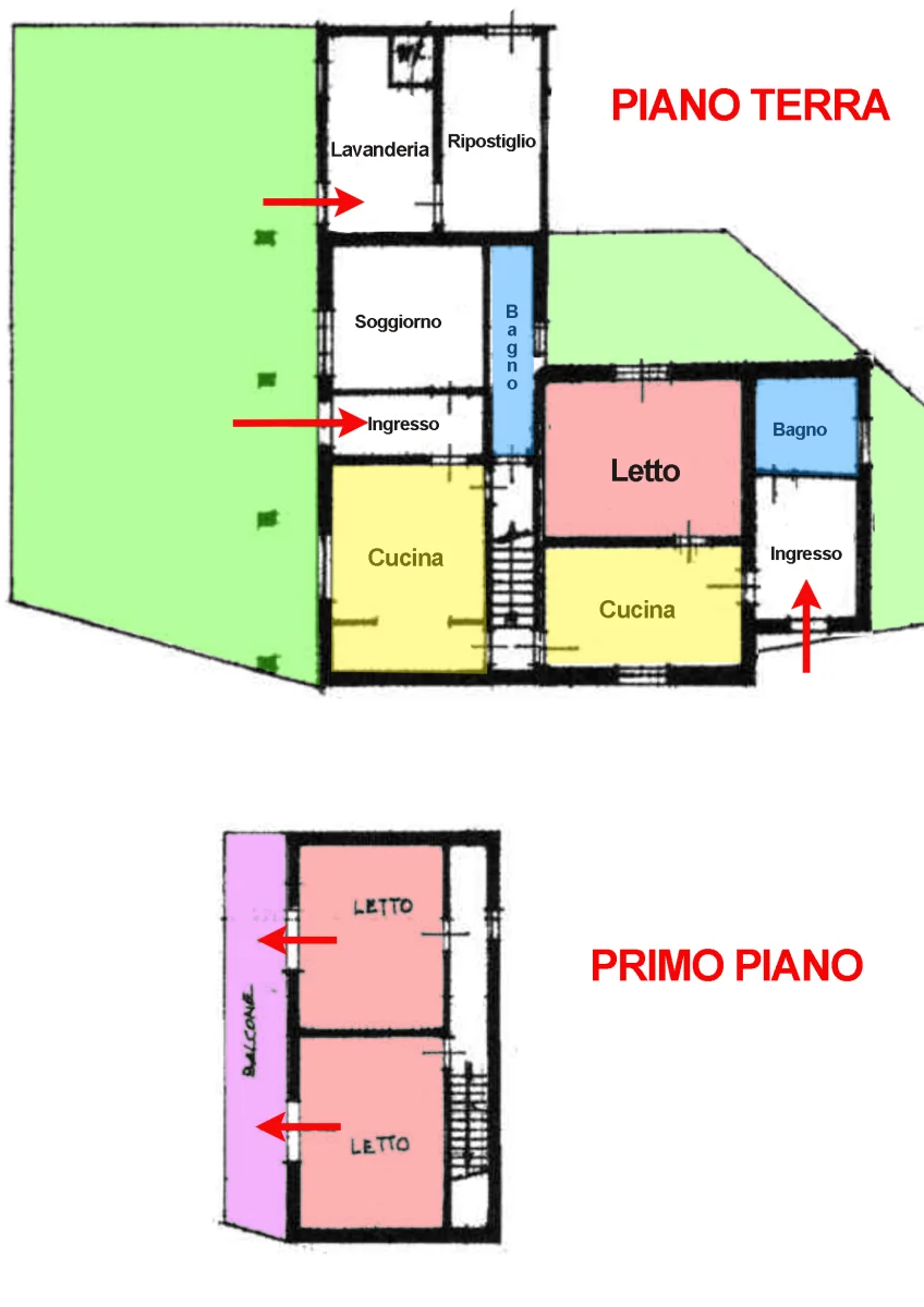 Piano Terra: doppio ingresso, soggiorno, 2 cucine, 1 camera matrimoniale, 2 bagni, ripostiglio e lavanderia con scala interna per l’accesso al piano superiore;